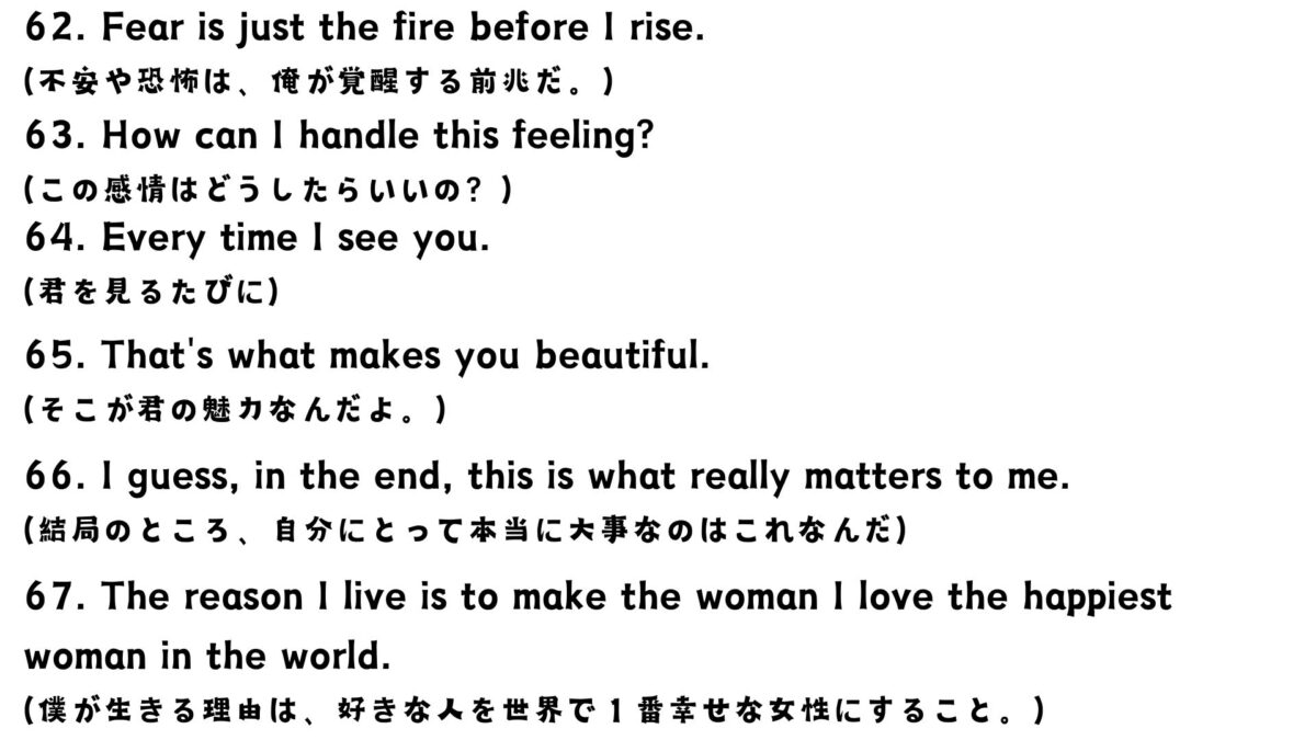 62. Fear is just the fire before I rise.(不安や恐怖は、俺が覚醒する前兆だ。)63. How can I handle this feeling?(この感情はどうしたらいいの?)64. Every time I see you.(君を見るたびに)65. That’s what makes you beautiful.(そこが君の魅力なんだよ。)66. I guess, in the end, this is what really matters to me.(結局のところ、自分にとって本当に大事なのはこれなんだ)67. The reason I live is to make the woman I love the happiest woman in the world.(僕が生きる理由は、好きな人を世界で1番幸せな女性にすること。)